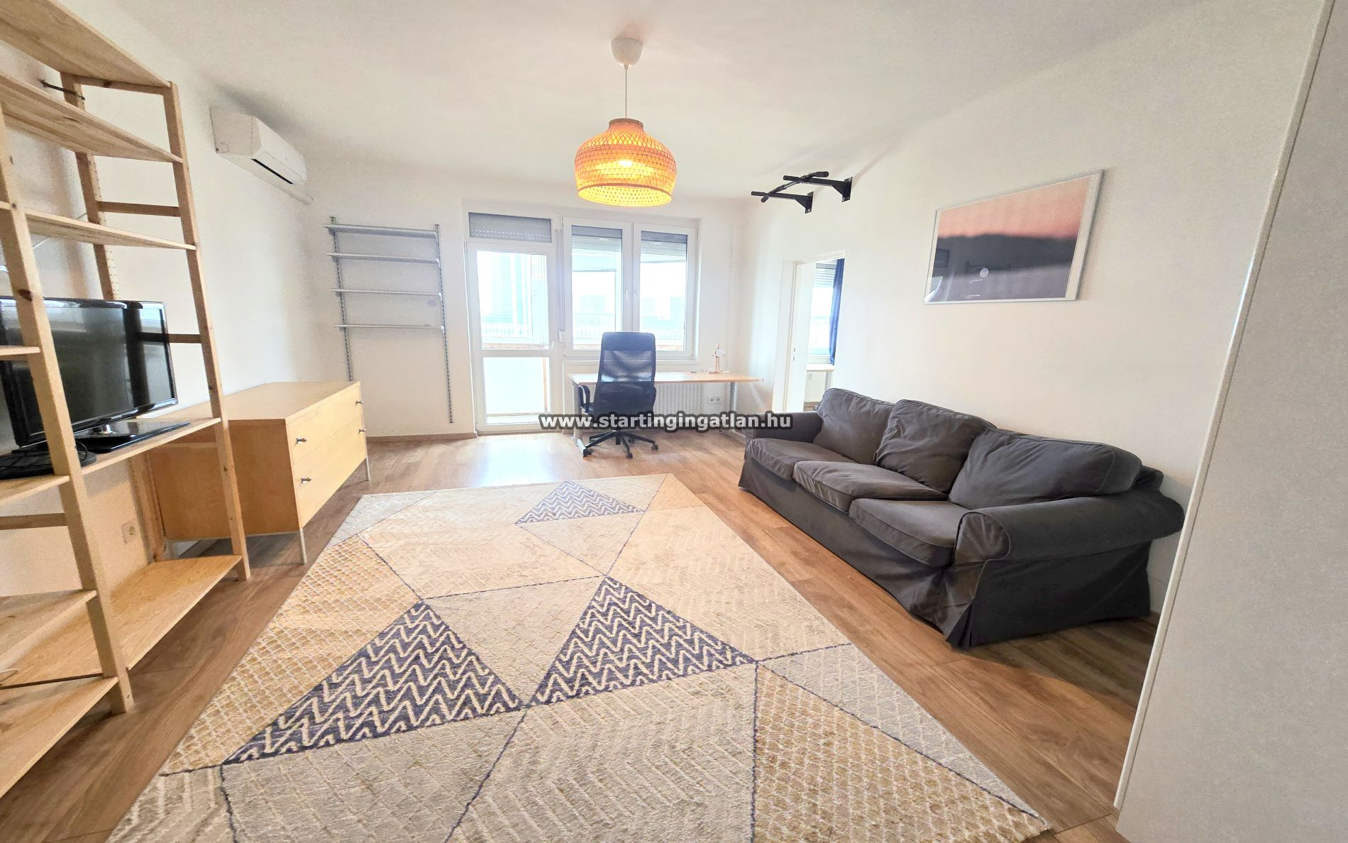 A lakás elrendezése praktikus, két különnyíló szobával rendelkezik, így a nappali és a hálószoba kényelmesen elkülönül. A csendes, világos terekhez egy 3 m²-es erkély is tartozik, ahonnan kellemes panoráma nyílik. A lakás teljes mértékben bútorozott, valamint gépesített, mosogatógéppel és klímával felszerelt, a fűtést távhő biztosítja.